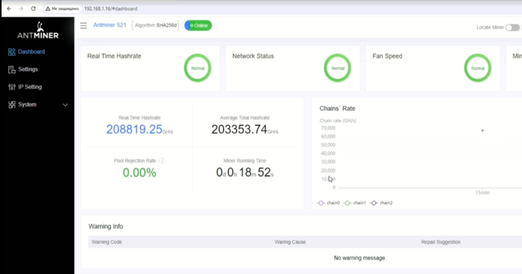 Через 2–5 минут начнётся майнинг. На главной странице в интерфейсе майнера появится хешрейт и статус Normal.