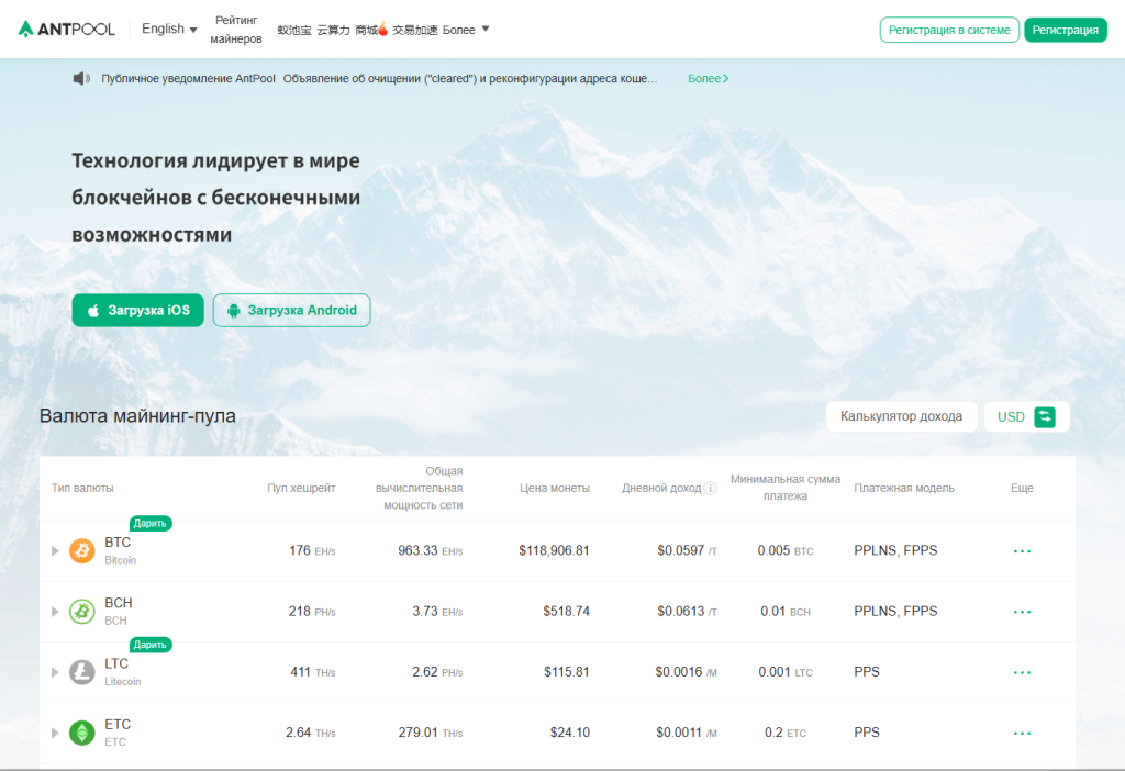 Antpool — один из старейших и крупнейших пулов, принадлежит Bitmain — производителю оборудования серии Antminer.